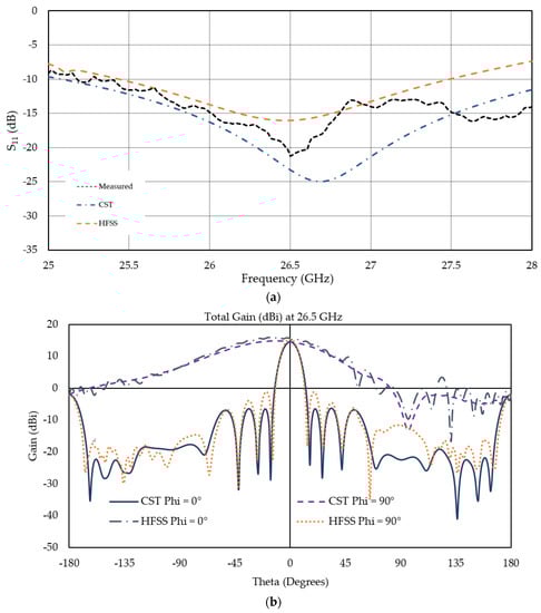 Figure 6. (a) S11 comparison among CST, HFSS, and measured values and (b) gain comparison obtained from CST and HFSS at 26.5 GHz.
