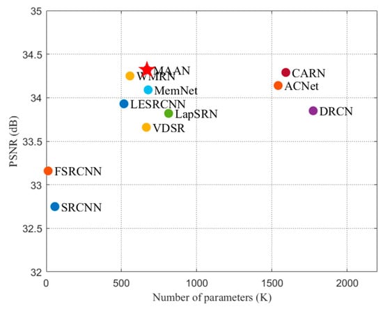 In this work, we address a lightweight multi-scale asymmetric attention network (MAAN), with a diverse network architecture design to gain better performance. MAAN fully utilizes multiple path aggregation of the middle- and deep-layer features to achieve more accurate extraction. On the one hand, it presents asymmetric multi-weight attention to recover high-frequency feature details and refine important information. On the other hand, a 1 × 1 convolution operation is implemented to reduce the parameters and improve the training efficiency of the network. The peak signal-to-noise ratio (PSNR) is the most commonly used reconstruction quality metric in image SR. The PSNR is determined by the maximum pixel value and the mean square error comparing the reference image to the SR image. The more the parameters, the higher the PSNR value and the quality of the reconstructed image and the better the performance. As Figure 1 shows, compared to the state-of-the-art SR networks, MAAN obtains the best PSNR with appropriate parameters.