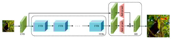 Finally, in the last stage of the model, we reduce artifacts by using an upsampling operation with sub-pixel convolution, and the enlarged features are mapped to the SR image through a 3 × 3 convolution layer. As shown in Figure 2, and are transmitted to the reconstruction block, , via a global residual connection.