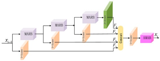 As depicted in Figure 4, MARB applies multiple paths to combine the multi-scale features, with one 3 × 3 convolution layer at the top and two 3 × 3 convolution layers at the bottom to expand the perceptual field and achieve better feature correlation. It can be expressed as follows: