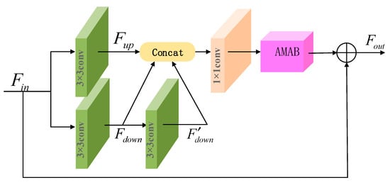 The concatenated features of multiple branches are fused by a convolution operation with 1 × 1 kernel size. Then, AMAB is applied to significantly enhance the feature flow, allowing higher weights to be assigned to more important features and high-frequency refining details. It can be expressed as