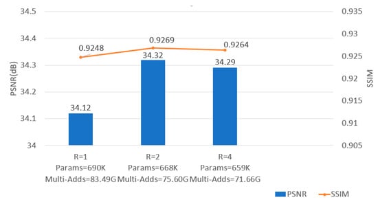 For analyzing the value of reduction ratio R in asymmetric convolution, we conducted two extra models for comparison. We set R = 1 and R = 4, respectively. In Figure 6, compared to the first two models, MAAN obtained the best results with the advantages of split channels, making the value of PSNR increase dramatically from 34.12 to 34.32, and the SSIM value consequently improved by 0.0021. Simultaneously, the number of parameters decreased by 28 K, and the computational cost, i.e., multi-ddds, dropped by 7.89G. Asymmetric convolution improved feature representation through channel changes. However, if the number of channels is compressed too low, there will also be a loss of some detailed features. Meanwhile, these changes also imply that effectively using the correlation of asymmetric multi-weights attention within the image can significantly assist in extracting accurate features from the image.