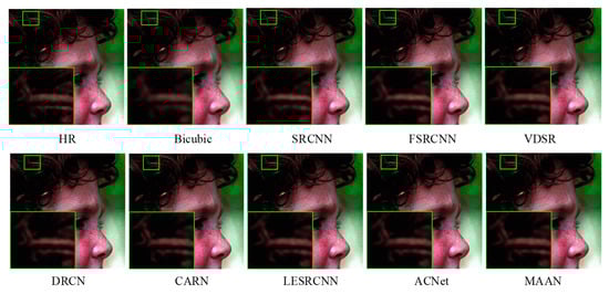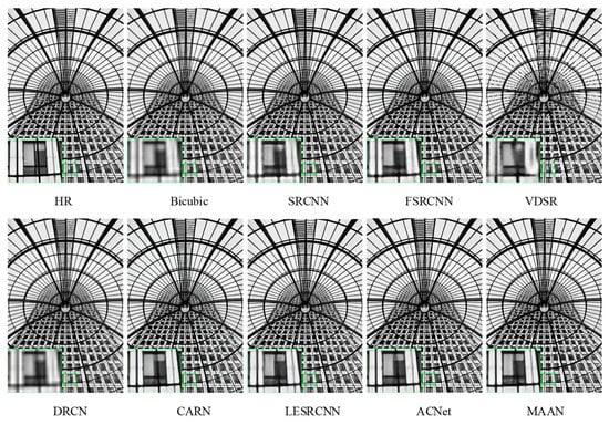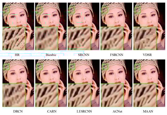 Figure 7, Figure 8 and Figure 9 show a visual comparison of the different scale factors on the benchmark dataset. In Figure 7, MAAN shows qualitative comparison over Set14 for scale factor ×2. Many methods cannot reconstruct the enlarged outline of the left side of the boy’s hair strands, whereas MAAN can recover the hair details well, fully reflecting the role of AMAB and allowing a complete recovery of high-frequency details. In Figure 8, MAAN displays qualitative comparison over Set5 for scale factor ×3, most methods reconstruct images with severe blurring artifacts and fail to restore headpieces clearly. In contrast, MAAN removes artifacts and recovers a higher-quality image. Qualitative comparison over Urban100 for scale factor ×4 was as depicted in Figure 9, although CARN, LESRCNN, and ACNet can produce slightly sharper lines, their lines suffer from significant distortions. In comparison, MAAN combines multi-scale features to expand the receptive fields to capture richer multi-frequency information features. MAAN can overcome this point and have the effect of more accurately reflecting the details of the HR image, thus reconstructing satisfying results.