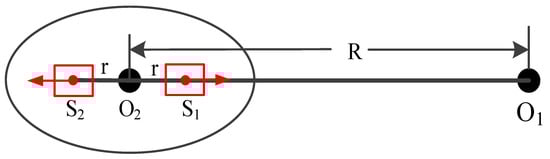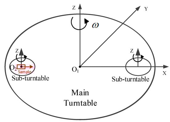 The double turntable centrifuge consists of a main turntable and two sub-turntables as shown in Figure 1 where O1 and O2 are the rotation centers of the main turntable and sub-turntable, respectively [10,24]. The centripetal acceleration imposed on the accelerometer is generated by the main turntable, and the input axis of the accelerometer can be adjusted by rotating the sub-turntable.