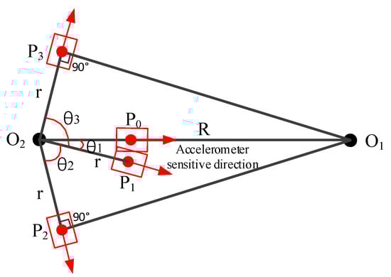 where r is the distance between the sensitive center of the measured accelerometer P0 and the rotation center O2 whose unit is m.