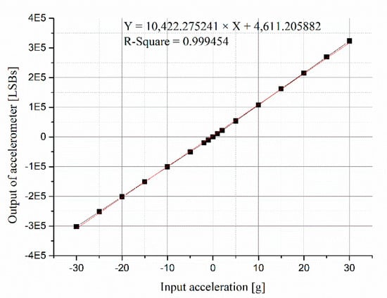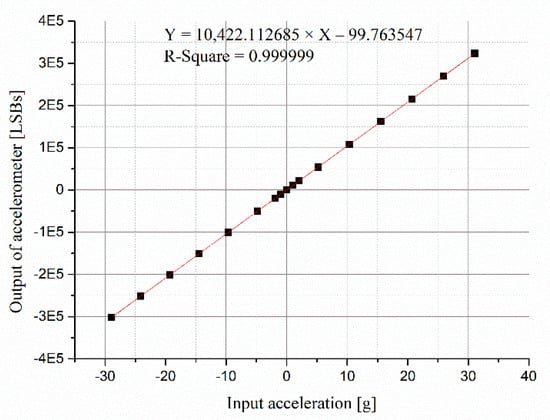 The output of the accelerometer was analyzed with the input acceleration before and after calibration. The linear fitting curves of the scale factor before and after calibrating the input acceleration are shown in Figure 6 and Figure 7, respectively. The data of the horizontal axis in Figure 6 are accelerations of centrifuge, and the data of the horizontal axis in Figure 7 are calibrated input accelerations.