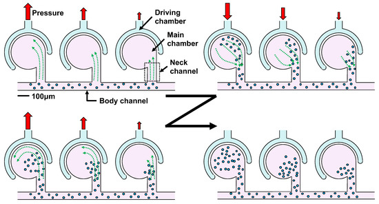 The authors developed an active mixer (outer-circumference-driven mixer) that uses the inequality of flow during the expansion or contraction of chambers [32,33,34,35,36]. The driving principle of the outer-circumference-driven mixer is shown in Figure 1. The outer-circumference-driven mixer comprises a main chamber that mixes the two liquids, a driving chamber that surrounds the main chamber, a body channel through which the liquid flows, and a neck channel that connects the main chamber to the body channel. When pressure is applied to the driving chamber, the main chamber expands and contracts through the elastic wall. When this process is repeated, the liquid in the body channel is gradually absorbed into the main chamber with a slight back and forth movement through the neck channel. This repeated expansion or contraction mixes with the liquid in the main chamber and reaches the concentration in the body channel. When the main chamber reaches the desired concentration, air can be injected into the body channel to maintain the concentration in the main chamber.
