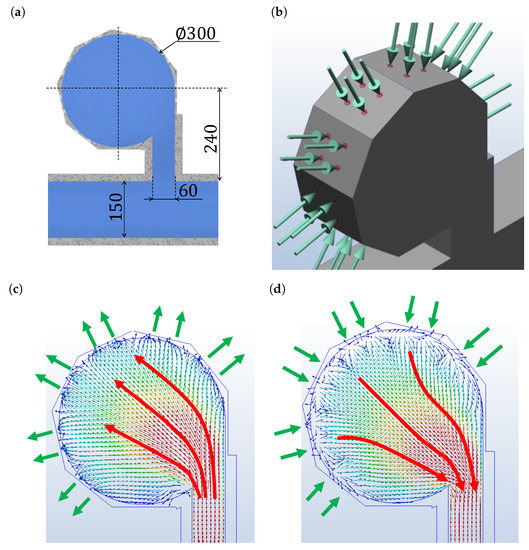 Simulation results. (a) Main chamber model. Because the surface to which pressure is applied must be flat, the outer shape was polygonal. (b) How to apply pressure to the main chamber. Since it was not possible to simulate the change in flow owing to the deformation of the wall, it was assumed that pressure is applied. (c,d) Streamlines during expansion and contraction. Streamlines were different between expansion and contraction; therefore, the net vortex was created by repeating this process.