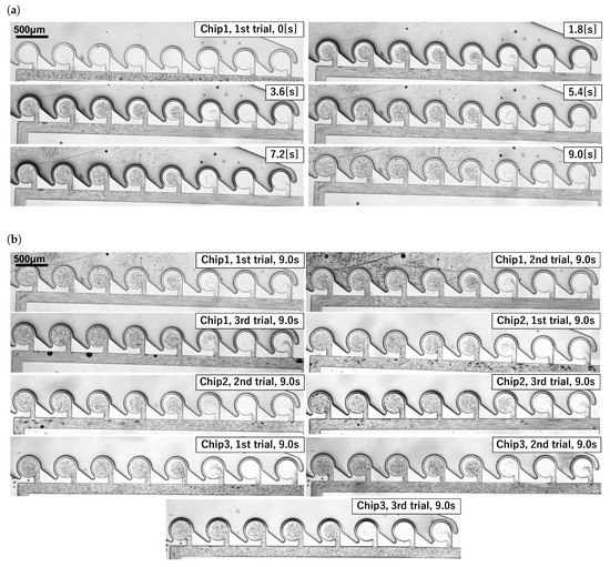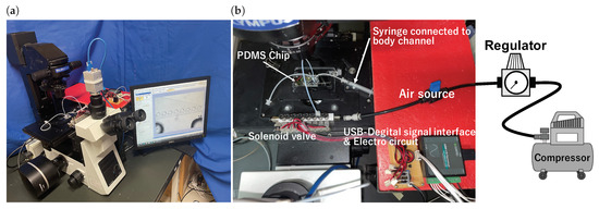 Figure 4 shows the experimental apparatus and microchip drive unit. The air was supplied from the compressor (AK-T20R, Max Co., Ltd., Japan.) to the solenoid valve, which was controlled by the microcomputer (AIO-160802AY-USB, CONTEC Co., Ltd., Japan) through the regulator. This air was supplied to the driving chamber, and the air pressure causes a volume change in the driving chamber. The main chamber was filled with pure water, and a mixture of 3 μm microbeads (Polybead Polystyrene 3.0 Microspheres, Polysciences Inc., Philadelphia, PA, USA) and pure water flowed in the body channel. We used 3 μm microbeads to improve the streamlines more easily to see and increase the contrast for easier analysis.