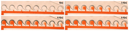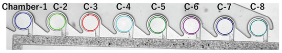 The flow path shown in Figure 6 was successful in generating a concentration gradient, but the chambers at both ends did not adhere to the gradient due to wall friction. If the goal is to generate the concentration gradient, the liquid in the chambers at both ends can be discarded, and the concentration gradient can be realized in the other main chambers. The volume of the main chamber of the channel designed in this study was 7.06 nL; therefore, even if the liquid in the chambers at both ends was discarded, the advantage of reducing the amount of liquid waste was not lost.