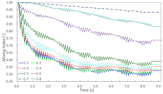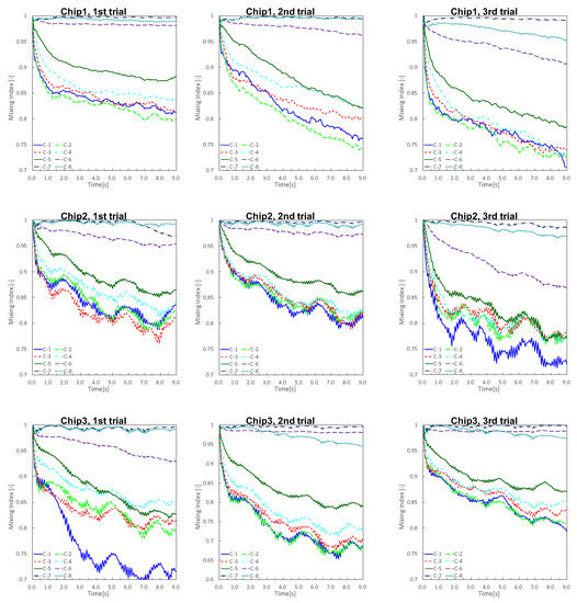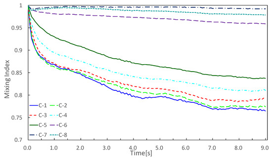 Time variation of mixing index in experiments using colored water. We obtained s similar result as that in experiments using 3 μm microbeads. Final mixing indices were C-1, -2, -3, -4, -5, -6, -8, -7.