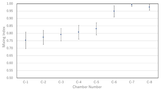 The experimental results are shown in Figure 6, where Figure 6a denotes the time variation of an experiment, and Figure 6b denotes the results obtained 9 s after the start of the experiment. The time variation of the concentration until 9 s after the application of air pressure is shown in Figure 7, where C-n indicates the n-th main chamber from the left. The raw data are very difficult to see, and the graph was drawn using 3 points of a simple moving average (raw data and why a simple moving average was applied are in Appendix B). The indicates the degree of mixing; the lower the is, the more the beads are absorbed and mixed. Similar results were obtained in all experiments, with a gradual decrease in concentration starting from the left chamber. Figure 8 is a graph showing the mean and standard error of after 9 s for the nine experimental results. The standard error of C-1 was large ( standard errors of C-1 and C-2 were 0.0199 and 0.169).