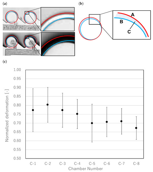 where denotes normalization deformation, X denotes each region, denotes the total pixel values of the region, denotes the pixel value at , and denotes the number of pixels of region X. Figure 12c shows the normalized deformation of the wall. It was confirmed that the pressure gradient was generally generated in the order of the concentration gradient. The standard error of C-1 was also larger than that of other regions (standard errors of C-1 and C-2 were 0.0431 and 0.348, respectively); therefore, as shown in Figure 7, the concentration of C-1 was unstable, so it was difficult to adjust the concentration according to the pressure gradient.