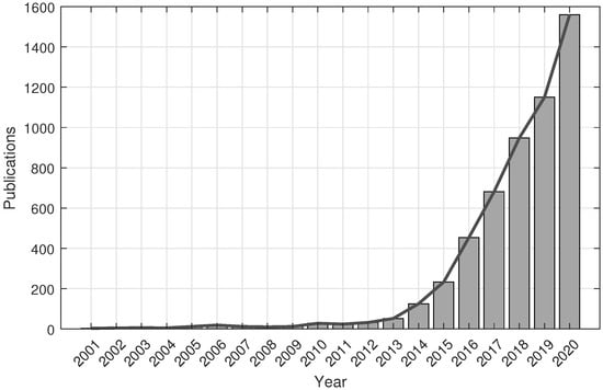 Publication trends. The bar graph shows the total number of publications per year from 2001 to 2020 (in Google Scholar: https://scholar.google.com/, accessed on 26 July 2021) with keywords: “3D printing”, “microfluidic” and “additive manufacturing”.