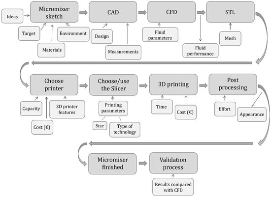 Regarding the AM with 3D printing of micromixers, throughout the entire process (from design to the manufacturing of the printed part), some decisions have to be made. Several aspects must be analysed: the affordable price, the materials used to achieve certain properties, type of printer, model dimensions, required precision, etc. The choices made will determine the quality and costs of the final micromixing device.