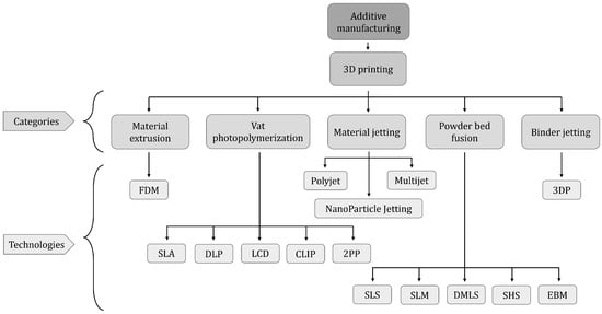 Five 3D printing categories with their respective technologies.