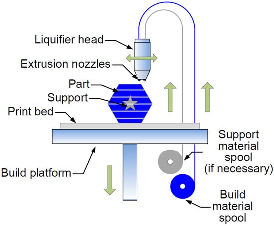 For unfamiliar readers, FDM consists of extruding a molten filament of polymeric material to be deposited afterwards. The material used in the FDM process is a filament of polymeric material that is softened and melted with the help of heat and then extruded. The filament is pushed and fed through a nozzle with a specific small diameter and then deposited layer by layer on the printing bed [63]. The filament has a standard diameter, which can be either 1.75 mm or 2.85 mm, and is supplied on spools. The most common FDM printers have a standard Cartesian structure and an extrusion head. The filament is unwound from the spool with the help of a motor and a set of gears, knurled pulleys, and clamping screws that press and drive the filament in order to push it through a guide tube into the extrusion head. This process is performed as more material is needed to continue the construction of the 3D part. The extrusion head can have several extruders, each of them with a chamber that is heated, thus achieving the objective of softening the filament inside up to a certain viscosity, and then passing through the nozzle when pressure is applied [4]. The nozzle is interchangeable and also has standard-size diameters, which can vary from 0.3 mm to 0.6 mm, depending on the machine and/or the chosen manufacturing company [64,65]. It should be noted that the gap between the nozzle and the printer bed also corresponds to the thickness of the build layer, which is a factor to be taken into account when performing the calibration process before starting to print a part, as it is very important to establish the correct nozzle height and level the bed [66,67].