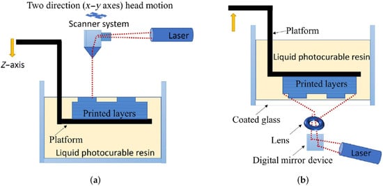 Illustration of the SLA and DLP technologies: (a) SLA and (b) DLP. (Reprinted from Fiber-Reinforced Nanocomposites: Fundamentals and Applications, 1st Edition, Dikshit, Vishwesh and Goh, Guo Dong and Nagalingam, Arun Prasanth and Goh, Guo Liang and Yeong, Wai Yee, Recent progress in 3D printing of fiber-reinforced composite and nanocomposites, 371–394, Copyright (2020), with permission from Elsevier).