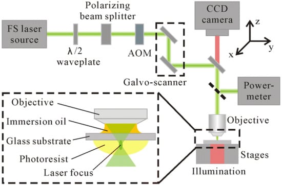 2PP technology. (Reprinted from Nanoscale Research Letters, Volume 14, Lei Zheng, Kestutis Kurselis, Ayman El-Tamer, Ulf Hinze, Carsten Reinhardt, Ludger Overmeyer and Boris Chichkov, Nanofabrication of High-Resolution Periodic Structures with a Gap Size Below 100 nm by Two-Photon Polymerization, 1–9, Copyright (2019), with permission from Springer Open under the terms of the Creative Commons Attribution 4.0 International License: http://creativecommons.org/licenses/by/4.0/, accessed on 15 November 2021).