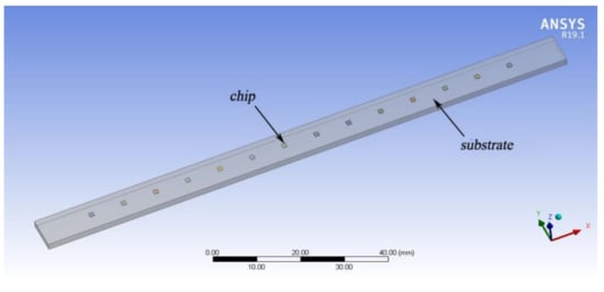 The LED filament is comprised of a chip, a substrate, a gold wire, silica gel, etc., and the chip and the substrate are connected by a bonding material. The finite element calculation software is used to build a 3D model of an LED filament []. In order to more easily facilitate analysis, the solid crystal layer, electrode lead, silver-plating layer on the surface of the substrate, and the filling layer of the chip were omitted in the model; also, the chip is directly fixed without considering the contact thermal resistance of each layer. The LED chip size is 1 × 1 × 0.25 mm3; the thermal conductivity is 130 W·m−1·K−1; the substrate size is 129 × 8 × 2 mm3; and the thermal conductivity is 20 W·m−1·K−1. The simplified model of an LED filament built in the finite element analysis software consists of the substrate and LED chip. The number of chips on the substrate is 14. The model package of the LED filament is presented in Figure 1.