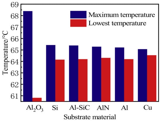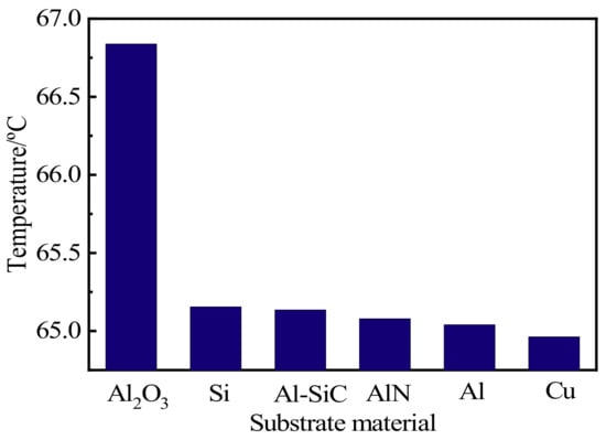 As shown in Figure 2, the high thermal conductivity of the substrate helps to reduce temperature rise. With the increase of thermal conductivity, the rate of change of high thermal conductivity is smaller than that of low thermal conductivity, which indicates that the gap of its heat dissipation effect will narrow when the substrate reaches a certain threshold of thermal conductivity. This is compatible with the conclusion of Yu. Yu et al. [] proved that improving the thermal conductivity of the substrate has no observable effect on improving the performance of the device while the thermal conductivity of the substrate is greater than a specified value. Figure 2 shows the temperature difference between the highest temperature and the lowest temperature for different substrate materials. The higher the thermal conductivity, the smaller the temperature difference. Moreover, as the temperature difference decreases, the heat resistance of the substrate in the heat dissipation process will decrease the temperature transmission barrier, so that the uniformity of the LED package becomes better and better. In summary, the heat dissipation effect of the Si, AlSiC, AlN, Al, and Cu substrates is preferable to the original substrate, and the temperature difference of Cu is the smallest.