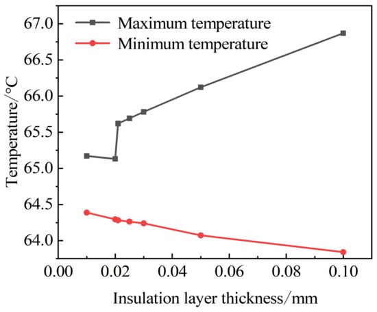 All five materials proposed reduced the junction temperature, and the junction temperature of the metal material Cu is the lowest. However, for safety, metal substrates need an insulating material or to be coated with an insulating film to prevent a short circuit or leakage caused by contact between other conductors and the substrate []. Therefore, Figure 4 shows the metal Al as an example of the temperature change of a multi-chip LED with different insulation layer thicknesses.