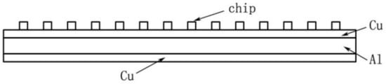 The temperature distribution of single-chip LED packages is related to the eccentricity of the chip. The larger the eccentricity of the chip, the higher the temperature of the substrate, with the central temperature lower than the temperature of the chips on both sides of the substrate []. Since each chip in a multi-chip LED filament has a rated heating power, the heat between each chip is superimposed after removing the influence of external temperature and humidity, which cause an uneven heat distribution on the module interface []. LED-chip heat dissipation is linked to the substrate and circuit selection process. Higher temperature causes the gold wires between the connected chips to break due to excessive internal stress, resulting in an open circuit and affecting the light-emitting quality of the LED []. As a result, it is imperative to solve the heat dissipation problem of multi-chip packaging.