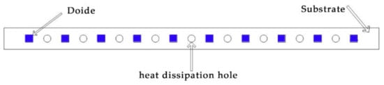 A light-emitting diode (LED) is a solid-state semiconductor device that can directly convert electrical energy into visible light []. LEDs are fourth-generation illumination sources, which have many improvements—such as higher luminous efficiency, faster startup, longer life, higher reliability, better energy savings, and increased environmental friendliness []—that help them meet the needs of various applications, such as displays [,], decoration, backlight, and lighting [,]. Multi-chip packaged LED arrays were designed to make the light output consistent with or even exceed that of traditional light sources []. Compared to traditional LED light sources, LED filaments realize 360-degree full-circumference light output [], which can reduce the number of optical devices needed and decrease optical loss [], thereby achieving higher lumen output. However, LED luminous efficiency can only reach 10% to 20% of the input power currently, with the remaining 80% to 90% of energy converted into thermal energy []. Moreover, LED filament lamps require simple and stylish designs, prohibiting the implementation of bulky heat sinks such as those used in traditional patches or light sources of chip on board (COB). Therefore, the heat-dissipation problem of LED filaments is a major bottleneck for the widespread application of LED lights. The substrate material, size of heat dissipation holes, spatial distribution of the chips, and the array mode are studied in order to determine the influence of different methods for heat dissipation of the LED filament package. This study aims to lay the foundation for obtaining the best heat-dissipation performance and to guide future LED filament design.