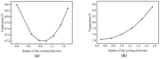 Figure 7a exhibits the maximum temperature corresponding to the heat dissipation holes of different areas. The heat dissipation is highest and the maximum temperature lowest with a heat dissipation hole radius of 1 mm. This is because the heat dissipation hole can increase the area of the air convection surface, resulting in more heat being released into the air and thus greater heat dissipation than the traditional structure. With the further increase of the radius, the influence of the change of substrate structure on the heat dissipation becomes larger, resulting in the increase of temperature. Figure 7b reveals the simulated temperature difference between the highest and lowest temperatures of different radii of heat dissipation holes. The increase of the heat dissipation aperture leads to a larger temperature difference, which indicates that the heat dissipation hole can achieve a beneficial effect of reducing the heat of the chip, but the lack of uniformity requires further research.