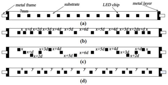 The pitch of the equally spaced chips is set to 7 mm. The arithmetic distribution of the chips arranges the chip pitch from the edge to the center in an arithmetic progression (x + nd) and distributes the chips symmetrically along the center of the substrate []. The first item (x) and the common difference (d) are 2 mm and 1.8 mm, respectively. The distribution of S-type chips, as the name implies, is in an “S” shape, with the distance between the chips consistent with the arithmetic arrangement (x = 2 mm; d = 1.8 mm). However, unlike the arithmetic arrangement, the “S” type effectively increases the actual distance between the two chips, which can enhance the heat dissipation of the chips while improving the illumination of the LED filament. The combination type of equal intervals differs from the distribution type of equal intervals: firstly, this method blends two chips with a distance of x (x = 2 mm) at one combination; secondly, the distance between this combination and other combinations is y (y = 12 mm); finally, as the central part of the substrate has the most heat, the chips in this region are arranged equidistantly (y = 12 mm). The schematic diagram of the four chip distribution packages is shown in Figure 8.