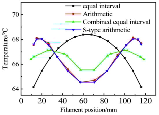 The finite element analysis results show that the highest temperature of LED filaments distributed at equal intervals is 68.388 °C, and the lowest temperature is 60.808 °C. The maximum temperature of the LED filament of the equidistant distribution is 68.038 °C, and the minimum temperature is 62.653 °C. The maximum temperature of the S-type equal difference is 68.154 °C, and the minimum temperature is 62.611 °C. The maximum temperature of the combined equal-spaced LED filament is 67.127 °C, and the minimum temperature is 63.609 °C. It can be seen from the above results that the maximum temperature of LEDs can be arranged from high to low as: equal interval > S-type equal difference > equal difference > combined equal interval. The three types of LED chip distributions proposed attain better heat dissipation, with the combined-type having the best performance. The temperature distribution of the chip is given in Figure 9. The difference between the maximum temperature and the minimum temperature of the conventional LED filament is the largest; additionally, the heat dissipation is uneven, which contributes to most of the chips being at a higher temperature. In the arithmetic and S-type arithmetic arrangements, the temperature of the middle chip of the LED filament is lower. Compared to the other two methods, the middle chip has the lowest temperature for longer durations. Further, the temperature on both sides is also decreased, which is conducive to the diffusion of heat to both sides rather than in only one direction. The minimum temperature difference and the significant heat dissipation effect of the combination are displayed in Figure 9. This method reasonably distributes the superposition of the LED heat so that the heat of the chip at each position is small, which can play a role in protecting the chip.