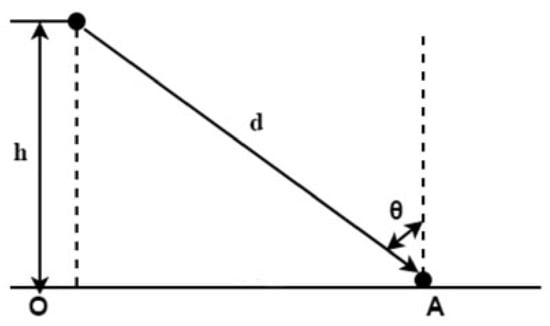 In the formula, E represents the illuminance, is the maximum light intensity in the light intensity distribution of the LED package, d is the distance from the point light source to point A, and is the angle between the point light source and the vertical direction. Because the distance from the point light source to point A is difficult to measure, it can be represented by the vertical distance, h, between the point light source and the illuminated surface. Therefore, the horizontal illuminance generated by point A can also be expressed by the following formula []: