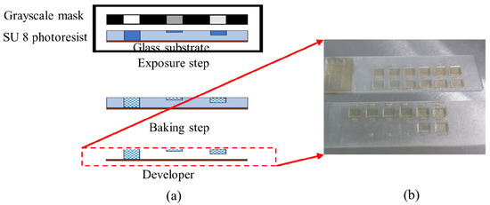 (a) Grayscale fabrication method and (b) real image of SU8 mold.