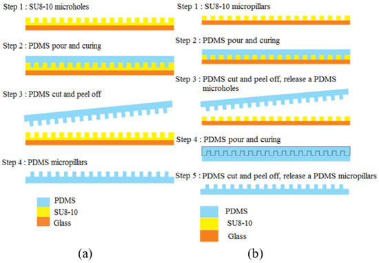 Fabrication steps of SU8 micropillar using (a) SU8-10 microhole mold, and (b) PDMS microhole mold (PDMS–PDMS pattern transfer).