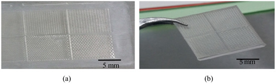 The process begins with the emulsion mask (High Precision Photo Plate from Konica Minolta Inc.) preparation. Emulsion mask was prepared by optical projection lithography using software-designed mask as the master mask. The software-designed mask was printed on a transparent based polyethylene terephthalate (PET) film. Then, the image on the software mask was transferred onto emulsion mask by using the Simple Mask Fabrication Machine (MM605 from Nanometric Technology Inc. (Tokyo, Japan)) in 5 to 1 scaling-down ratio. After that, the thick SU8 coat on microscope glass slide sample was prepared by dispensing 2.5 mL volume of SU8-10 on a clean 3-inch × 1-inch microscope glass slide from DURAN group. The coated glass substrate goes through a soft baking process at 95 °C for 7 h on a hotplate. Then, the coated glass substrate was aligned with the emulsion mask for UV light exposure. The exposure process was carried out using One Side Mask Aligner (LA4100_R1 Sanei Electric Inc. (Tokyo, Japan)) with power density 180 W of the i-line mercury lamp. The photoresist SU8-10 was exposed for 60 s by back side exposure method. The samples were baked at 65 °C for 2 min and then at 95 °C for 10 min. The samples were cooled down gradually, with 5 °C interval of temperature reduction until it achieved room temperature. Finally, the samples go through development process using SU8 developer to obtain the micro mold pattern as shown in Figure 3. The micro mold was then replicated by PDMS mixture. PDMS mixture was prepared with 10 to 1 weight ratio of base polymer and hardener solution. The mold was placed in an aluminum foil boat, and then the PDMS mixture was poured on top of it. The PDMS heat curing hardened and replicated the pattern on micro mold as shown in Figure 4a.