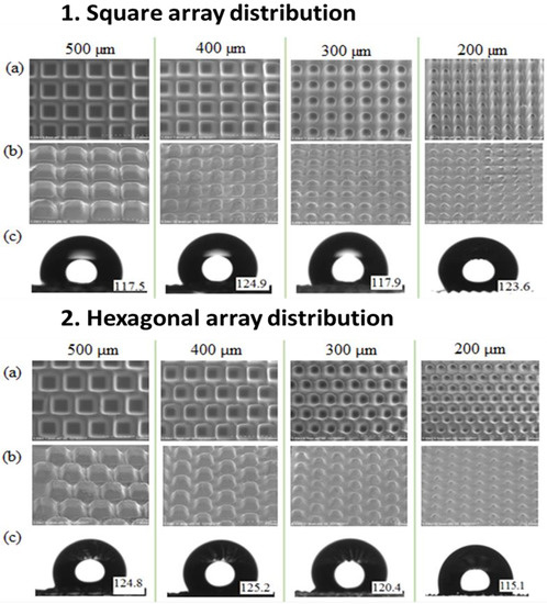 - Gao, J.; Zhao, J.; Liu, L.; Xue, W. Dimensional effects of polymer pillar arrays on hydrophobicity. Surf. Eng. 2016, 32, 125–131. [Google Scholar] [CrossRef]