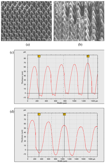 Many researchers have used the SU8-10 microhole mold to fabricate PDMS micropillars in their studies, as mentioned in Section 3.2 [7,18,19,20]. We carried out the second experiment with the fabrication of the PDMS micropillar array by replicating the microhole pattern on the PDMS mold which is also referred to as PDMS–PDMS pattern transfer. The PDMS mold with the microhole pattern was prepared by the same PDMS replication method by using the SU8 micropillar mold. The detailed steps of fabrication are listed in Figure 4b. Figure 9a shows the SEM images of the SU8 micropillar mold with a smaller square pillar cross section of 200 m, 100 m, and 80 m width. The wider bottom and narrower top of micropillars have been observed. This is the result of the back exposure method used in combination with the grayscale fabrication technique. In the back exposure method, the mask and SU8 were separated by a glass substrate. In addition, the thick SU8 coating results in a non-uniform light penetration through the SU8 with over exposed SU8 near the glass substrate and under exposed SU8 far off the glass substrate. Figure 9b shows the SEM images of the PDMS microhole replicated from the SU8 micropillar mold. Then, the PDMS–PDMS pattern transfer process was carried out, and SEM images of the resulting PDMS micropillar from the PDMS microhole mold replication are shown in Figure 9c. The water droplet images on the micropillar arrays with the measured water contact angles are described in Figure 9d. Figure 10 and Figure 11 show the detailed measurement of micropillar width of 80 m and 200 m, respectively. The measurements of the SU8 micropillar mold and PDMS micropillar height were carried out by using a surface profiler and are summarized in Table 1.