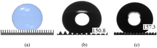 Cassie–Baxter super hydrophobic wetting state of the PDMS surface; (a) schematic, (b) actual measurement (minimum 150.8 degrees), and (c) actual measurement (maximum 157.3 degrees).