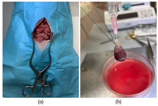 (a) Heart explantation—preparing the access to the retroperitoneum. (b) Representative image of rat heart before the decellularization process.