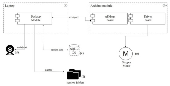 The Monitoring System is composed of the following elements: (a) Desktop module, (b) Arduino module, (c) Stepper motor, (d) Web Camera, (e) Database, and (f) Session folders.