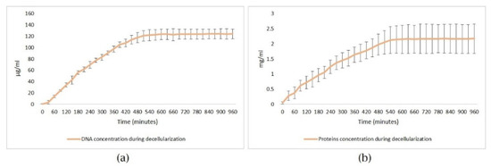 The mean value from the 10 decellularization sessions of total (a) DNA and (b) proteins concentration measured in the decellularization solution. Both DNA and proteins concentration reached the plateau at around 540 min.