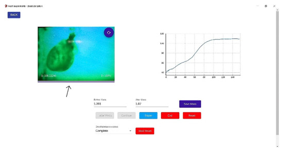 Application programming Interface. Once the process begins, the graphic of the live spectrometer metric can be seen on the upper right side. The progress bar below the camera stream is the classification metric (built with a Deep Convolutional Neural Network model) that shows the progress of the decellularization process (black arrow). The buttons below control the session and allow different commands such as starting, pausing, and ending. Resetting the position of the stepper motor to the initial phase is also possible. The weight of each rat heart is introduced in the program before starting the decellularization process.