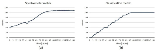 (a) Spectrometer metric in time and (b) classification metric in time (each point from the horizontal axis is the mean of 400 values collected during a cycle).