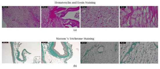 Two different stainings validated the removal of cellular components and the quality of decellularization. As an initial analytic step, H&E staining showed no intact cells, nuclei, or basophilic structures. Cross-sections of decellularized scaffolds stained with Masson’s trichrome maintained the collagen network but no signs of cardiomyocyte-specific nuclei (Figure 11a,b).