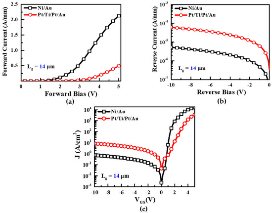 Figure 2a–c shows the I–V characteristics of both the forward and reverse region, and Schottky characteristics (J–V characteristics) of the Ni/Au and Pt/Ti/Pt/Au Schottky contacts on the AlGaN/GaN HEMTs, respectively. In Figure 2a, the Ni/Au Schottky contact showed a forward current of 2.13 A/mm at 5 V while Pt/Ti/Pt/Au showed 0.5 A/mm. The high Schottky barrier height of the contact may cause a reduction in forward current [32]. In the reverse region (Figure 2b), the Pt/Ti/Pt/Au device degraded and showed higher leakage current 6.04 × 10−5 A/mm at −10 V than Ni/Au (5.29 × 10−6 A/mm). The SBHs and ideality factors for the Ni/Au and Pt/Ti/Pt/Au AlGaN/GaN HEMTs are given by (1) and (2), respectively: