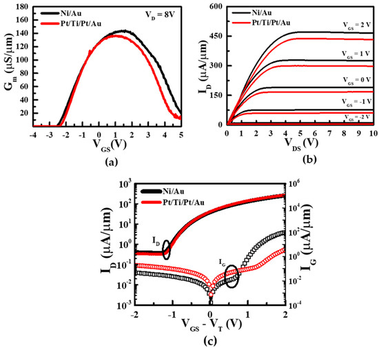 The transconductance showed almost similar characteristics of both devices at the same gate length of 14 um. The drain current in the Pt/Ti/Pt/Au device in Figure 4b was slightly lower than the Ni/Au gated device, indicating that the 2DEG carrier concentration below the gate area had decreased [7]. The transfer characteristics of the Ni/Au and Pt/Ti/Pt/Au contacts on the AlGaN/GaN HEMTs are shown in Figure 4a. The off-state leakage current of the Pt/Ti/Pt/Au HEMT was slightly higher than that of the Ni/Au HEMT. In the voltage region below −1.5 V, the Pt-based Schottky gate yielded a high forward leakage current. Extra tunneling of the currents has been suggested in the Pt gate due to the surface level of the MS state, as demonstrated by Zhang et al. (2006) [36]. Thus, the leakage current increased instead of reducing at the minimum forward bias.