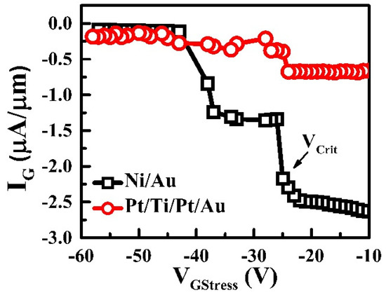 Critical voltages (Vcrit) of Ni/Au and Pt/Ti/Pt/Au on AlGaN/GaN HEMTs in the range of −10 to −60 V with stepped stresses. The Vcrit of Ni/Au was about −25 V and that of Pt/Ti/Pt/Au was unspecified for up to −60 V.