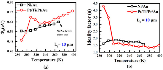 To investigate the barrier height and ideality factor of both devices, we repeated the same experiment with both Ni/Au and Pt/Ti/Pt/Au with different gate lengths of 10 μm and increased the temperature beyond 368 K to observe the degradation effect [40,41,42,43]. Figure 8a demonstrates the stress with temperature effect carried out on both devices. Barrier height of Ni/Au increased in a conventional way and the device burnt out at a 368 K temperature with the same off-state stress applied (VD = 50 V, VG = −7 V). The Pt/Ti/Pt/Au gated device had no breakdown issues after a temperature of 368 K. It was difficult to compare the ideality factor at a higher gate length (14 μm) due to high leakage current; therefore, we narrowed it down with shorter gate devices. We found a better ideality factor at a gate length of 10 μm compared to the gate length of 14 μm. Due to the high gate leakage current, the ideality factor (4.3) was high in Pt/Ti/Pt/Au [44,45]. However, after stress at 308 K, the ideality factor decreased, and was between 1 and 2 as the temperature increased.