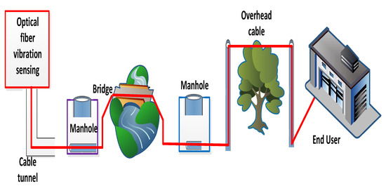 Several techniques to identify the dispersion and scattering issues inside optical fibers have been employed for a long-distance communication system, including their locations [1,2]. Out of these studied techniques, many researchers have addressed optical frequency domain reflectometry (OFDR) and optical time-domain reflectometry (OTDR) measuring procedures, which measure optical fiber losses with their positions [3]. Enhancing the estimating sensitivity, distance and resolutions are the key objectives of these mechanisms. If an abnormality or failure occurs inside the optical fiber, these techniques are used to identify the losses and location with the help of optical power [4,5]. The calculations of temperature and static strain distribution in the field of optical fibers have been investigated for many years [6]. Moreover, for measuring the dynamic strain of an optical fiber, a vibration procedure is employed on the optical fiber in terms of time variation estimations of the dispersed light waveform. The function of the fiber sensor is to recognize the fault in the attached fiber. For this purpose, the vibration measurement technique is considered a fruitful method which replicates the ability of hammering test [7]. The aim of this work is to design an optical fiber sensor network for all of society. The improvement and features of fiber vibration sensors are studied for optical fiber communication. The installed optical fiber for communication has physical contact in some places with the external environment. Therefore, the vibration is experienced by optical fiber continuously. The framework of an employed optical fiber for a communication system and its relationship with the external environment is explained in Figure 1. This declares that fiber cables applied for optical communications are disturbed in view of physical vibrations. These vibrations have the potential to identify the fault and its location [8]. Based on these properties of vibration, this paper investigates the development of distribution vibration sensing (DVS) technologies using OTDR and OFDR procedures for evaluating the fault inside the optical fiber. When measuring the vibration of an optical fiber, it is difficult to detect different states of vibrations for determining failure in optical fiber communication. Thus, it is necessary to measure the vibration and state of the fiber quantitatively and to estimate the complex amplitude of light dispersion inside the optical fiber. Taking these points in this model, we have investigated the detection of fiber vibration and its meaningful outcomes like the hammer test. The vibration measuring schemes based on frequency multiplexed OTDR are studied, including averaging the waveform to improve vibration measurements. Finally, the estimations of vibration in terms of OFDR and OTDR are compared to present which parameter gives efficient results.