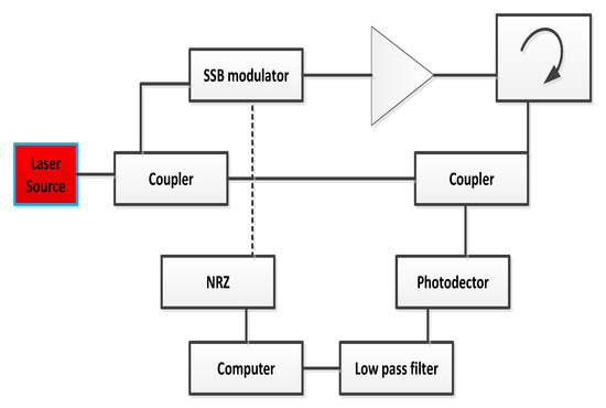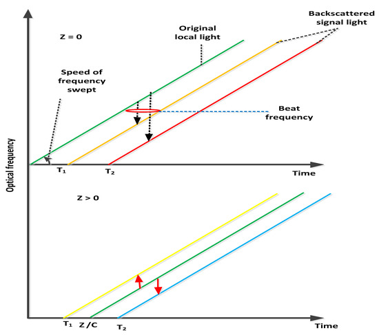 where , , and v denote the frequency-swept speed, backscattered light distance, local light path length and light speed in optical fibers, respectively. The conceptual background of the beat frequency is depicted in Figure 2 with and without local light Z path length. At , the beat frequency of the traditional OFDR system is single sided and proportional to the fiber under test (FUT) length. On the other side, the beat frequency is proportional to the relative distance for the condition among the distance of the backscattered and half distance of the local lights. The need for a high bandwidth receiver is decreased using this terminology for identifying a distance location. In addition, the beat frequency allocated by the relative distance is double sided and consists of positive and negative frequencies, which corresponds to shorter and longer distances. Equation (1) performs the conversion from the relative to the absolute domains [11,12]. The calculation model is presented in Figure 3, which shows that the relative distance estimation incorporates a delayed optical fiber for local light. It is also depicted in Figure 3 that a 90 degree hybrid optical is selected for discriminating the positive and negative beat frequencies. The purpose of installed low pass filter in the model described in Figure 3 is to minimize the aliasing induced in the transmitted signals. The temporal waveform of the electric field and frequency swept [13,14] are written as